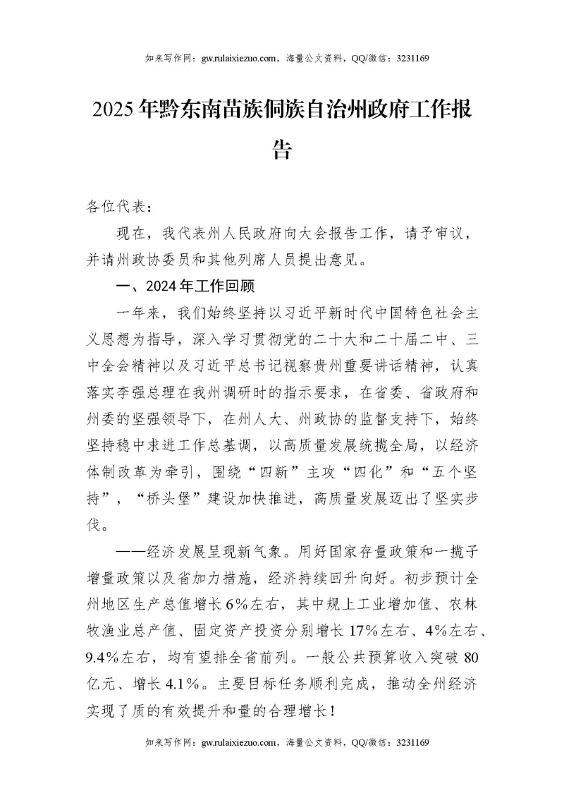 首页2025年政府工作报告2025年黔东南苗族侗族自治州***工作报告